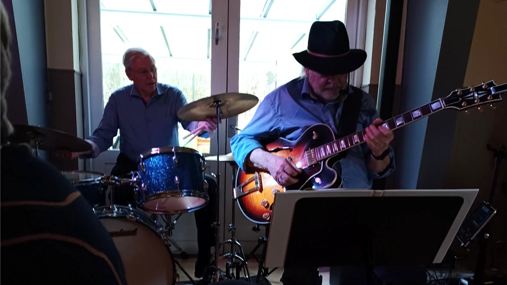En hyggelig eftermiddag med de 3 erfarne musikere, der spillede og sang rigtigt godt og hvor publikum sang godt med.